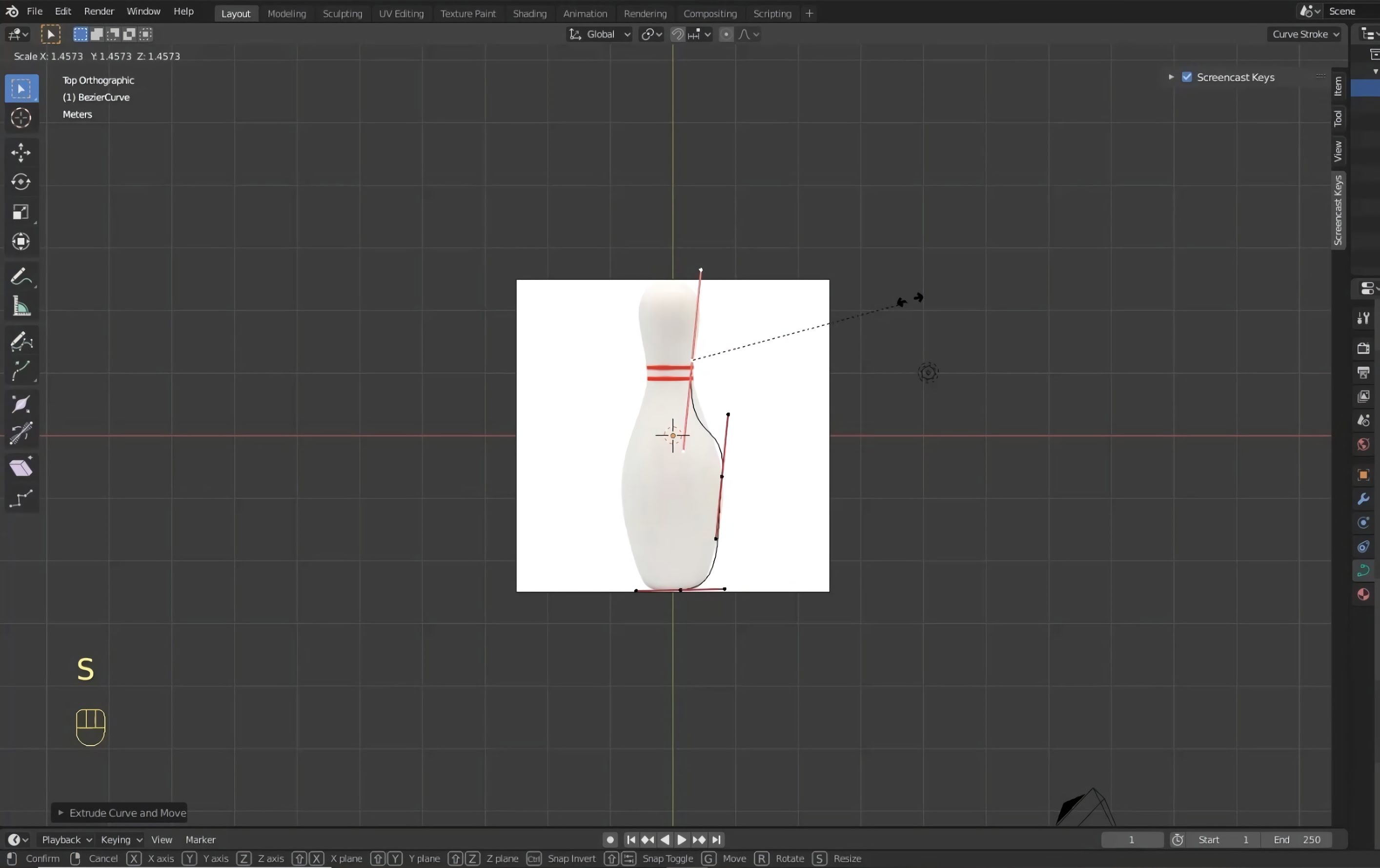 Once you're in edit mode, you will notice that the curve now has several points that you can control. These points are going to be used to move the curve such that it traces around your bowling pin image.