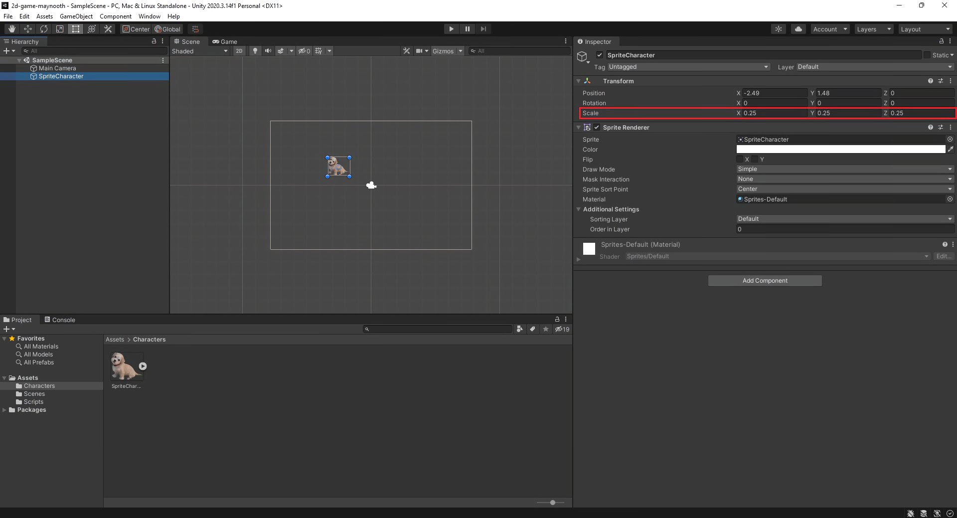 Note that Scamp is now in the Assets section of the Editor. She has been automatically imported as a Sprite. This is because we created the Project using the 2D template. (Sprites are 2D graphic objects often used in 2D game development).